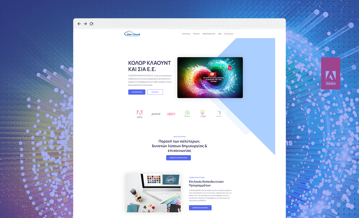 Η ιστοσελίδα colorcloud.gr σχεδιάστηκε και υλοποιήθηκε για να παρουσιάσει μια καινοτόμο εταιρεία ψηφιακών εκτυπώσεων και δημιουργικών λύσεων. Στόχος ήταν η ανάδειξη των υπηρεσιών και των προϊόντων της εταιρείας με μοντέρνο, φιλικό και επαγγελματικό τρόπο.